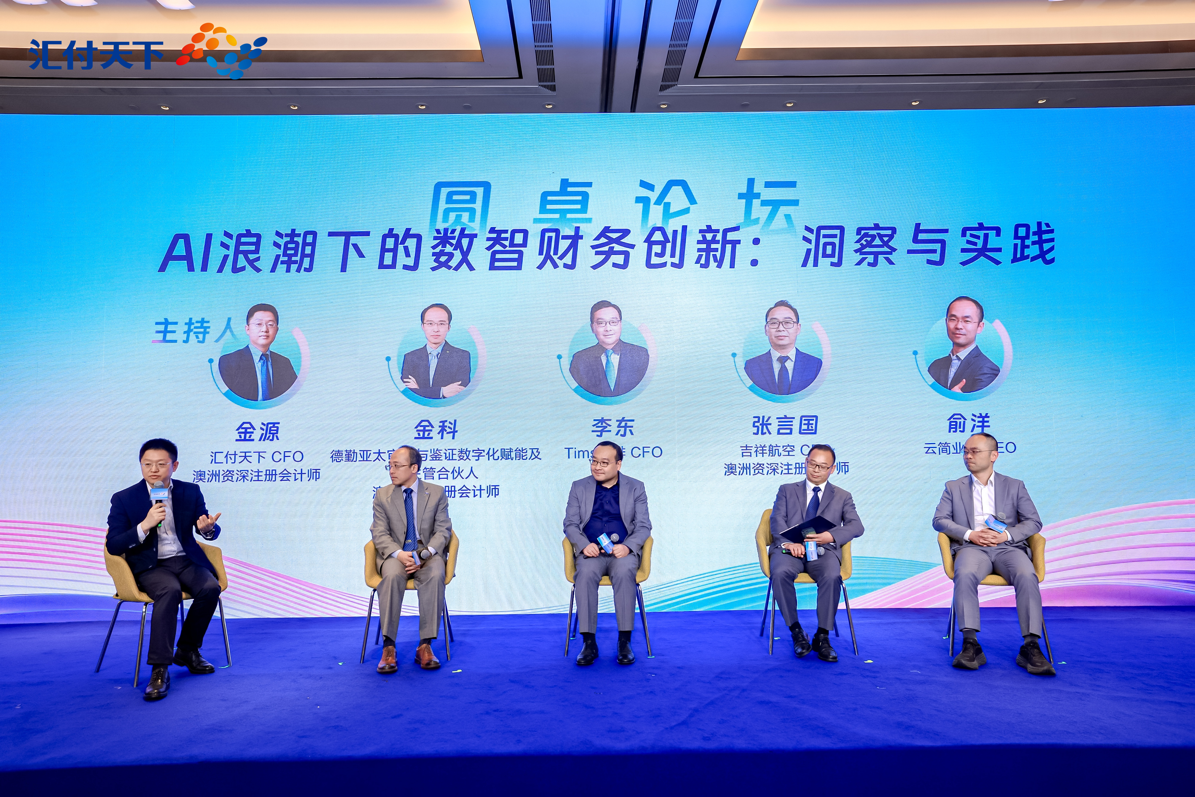 “AI 浪潮下的数智财务创新”圆桌,由汇付天下 CFO 金源主持,与德勤亚太审计与鉴证数字化赋能及 AI 主管合伙人、澳洲会计师公会华东和华中区委员会会长金科,Tims咖啡CFO李东,吉祥航空CFO张言国,云简业财CEO俞洋展开交流。