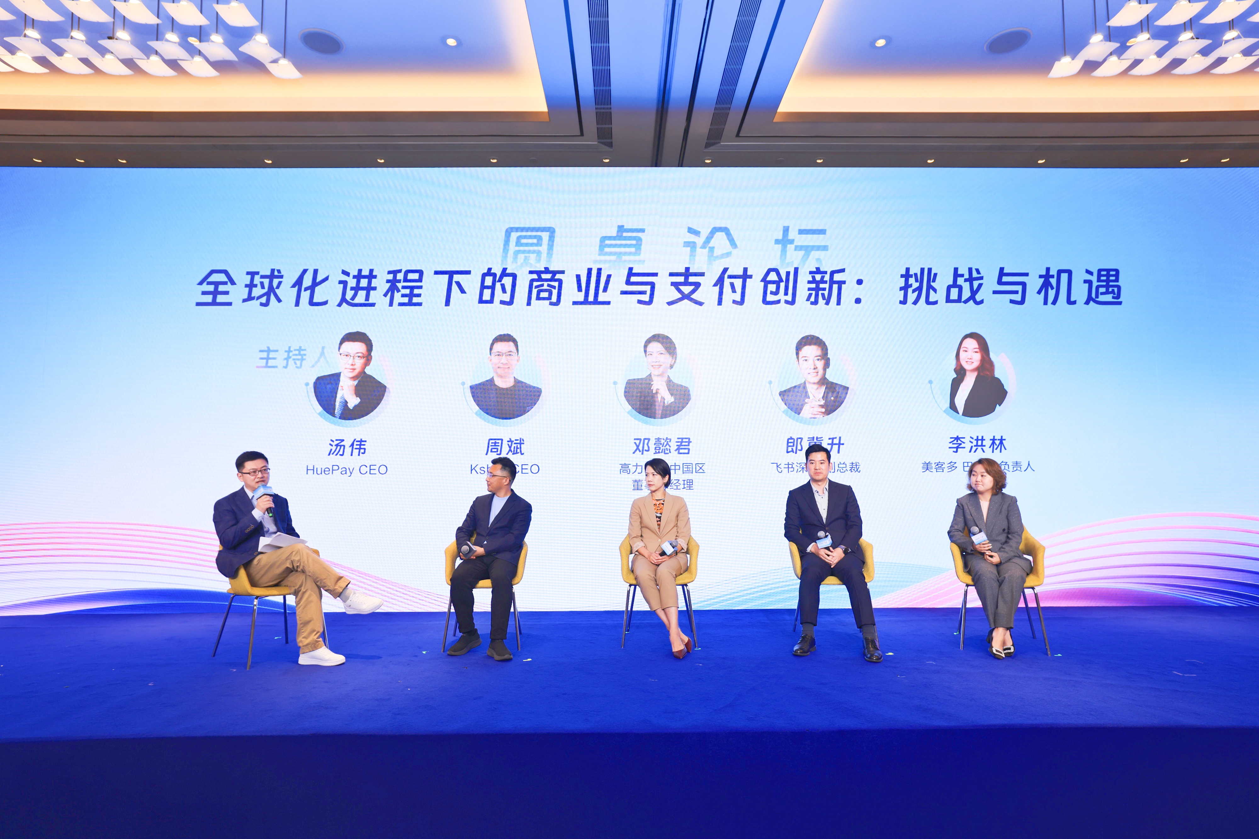 “全球化进程下的商业与支付创新”圆桌,HuePay CEO汤伟与 Ksher CEO周斌、高力国际中国区董事总经理邓懿君、飞书深诺副总裁郎冀升、美客多巴西站负责人李洪林等出海一线实践者,针对企业出海最真实的痛点展开剖析。